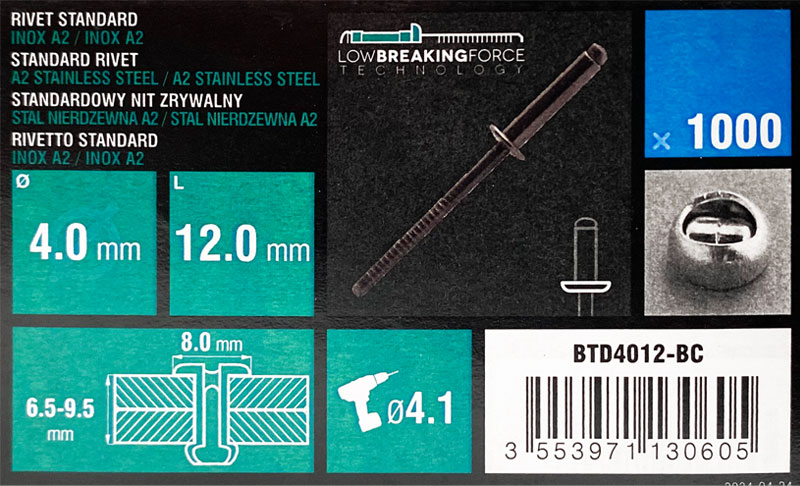 Nit zrywalny 4,0x12 otwarty-kołnierz półkul. z molet. trzp. A2/A2 w op. 1000szt.
