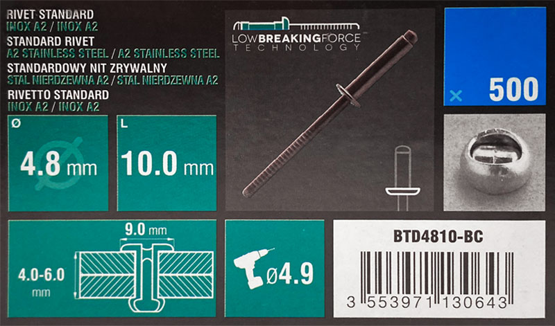 Nit zrywalny 4,8x10 otwarty-kołnierz półkul. z molet. trzp. A2/A2 w op. 500szt.