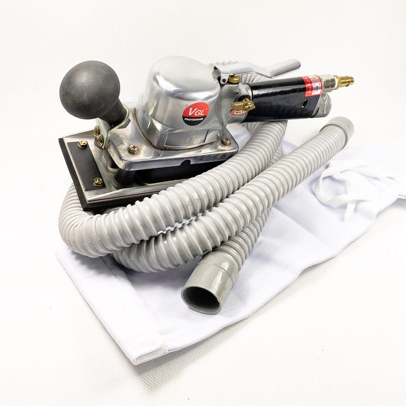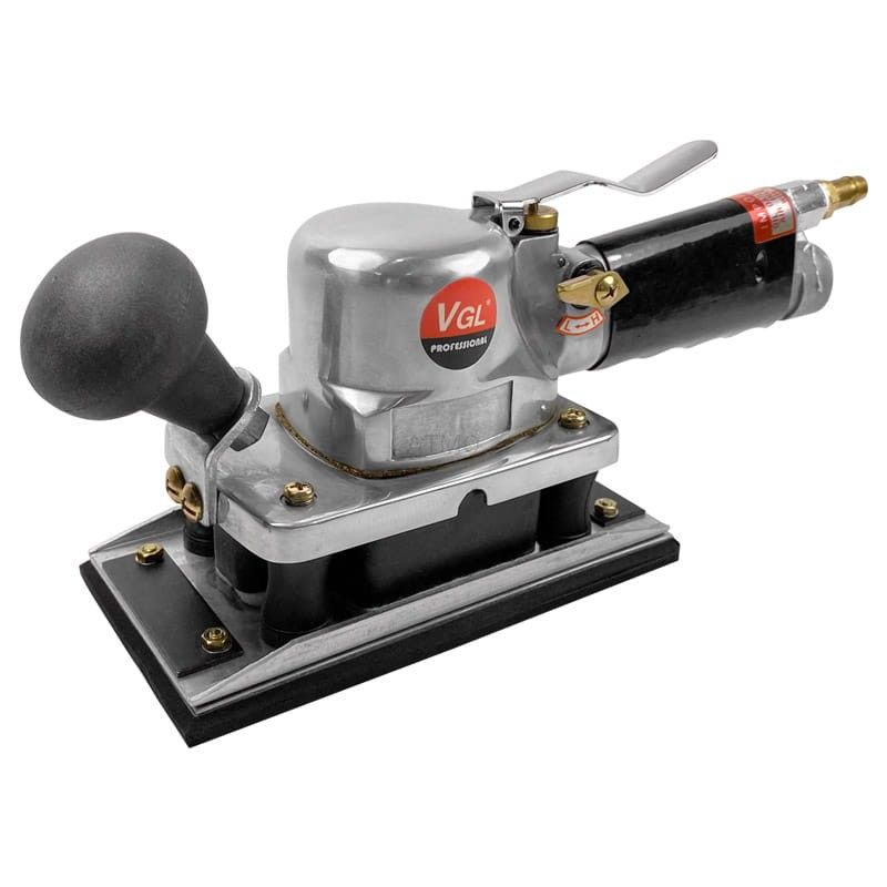 Szlifierka pneumatyczna ze stopą o wymiarach 176x93 przeznaczona do szlifowania metali, szpachli karoserii, usuwania rdzy i wygładzania powierzchni.