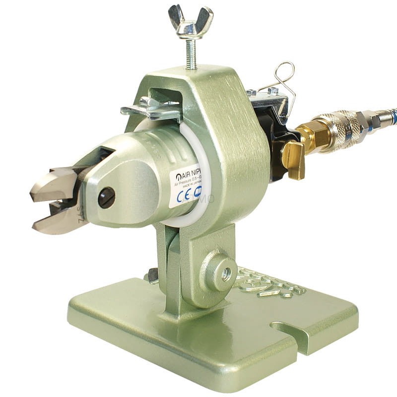 Przemysłowy uchwyt do szczypiec pneumatycznych NILE MR20. Pozwala na solidne zamocowanie szczypiec na stanowisku roboczym. Po podłączeniu szczypiec do włącznika nożnego FB70S i zamocowaniu ich w uchwycie operator zyskuje swobodę i precyzję pracy.